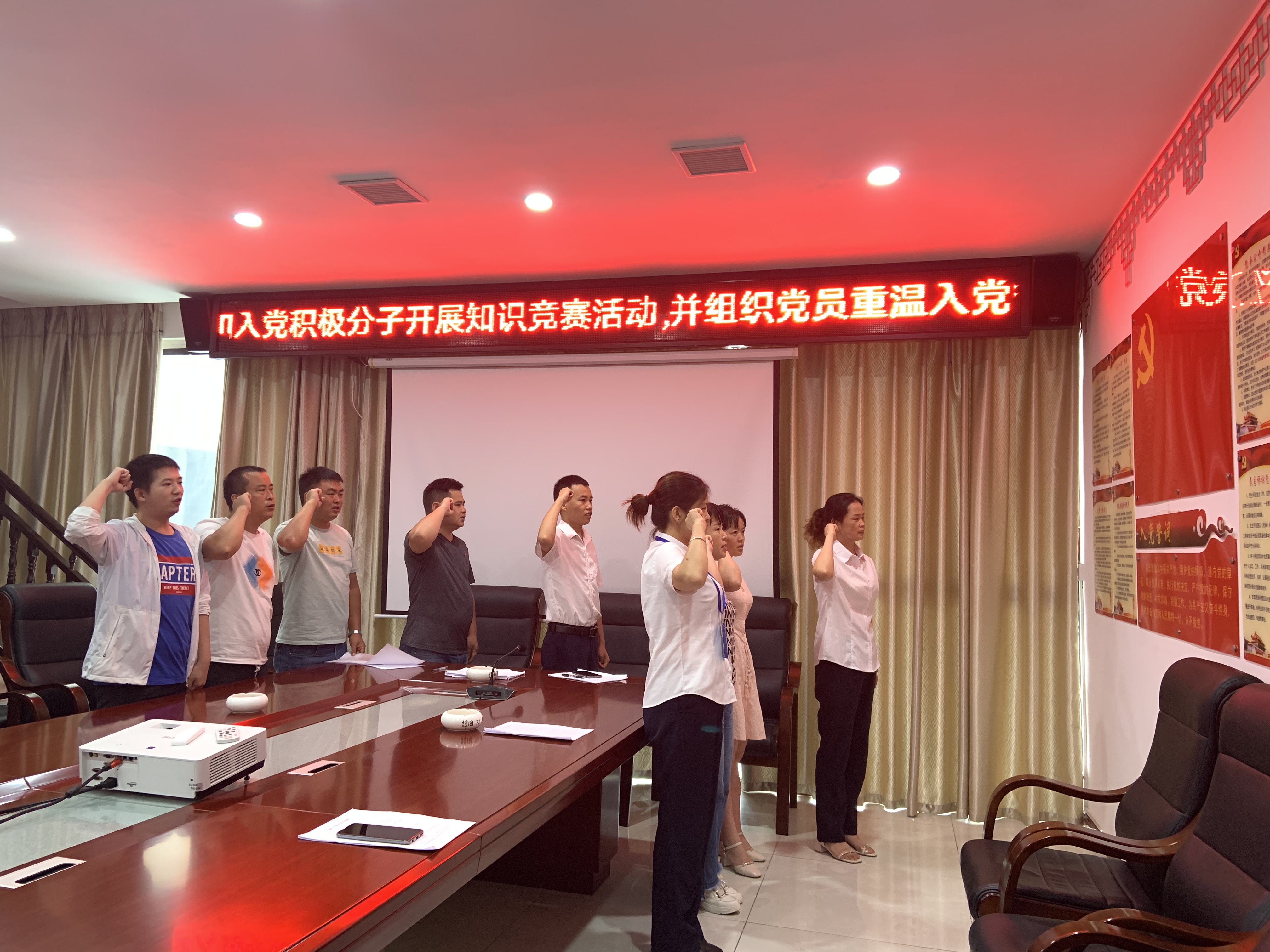 “我志愿加入中国共产党,拥护党的纲领,遵守党的章程……”党史知识竞赛结束后,在公司党支部组织委员欧壹琴的带领下,全体党员面对鲜红的党旗举起右拳,重温了入党誓词,现场气氛庄严热烈。简单而朴实的仪式,使公司全体党员再一次受到了深刻的爱国主义教育,更使大家进一步认识到了肩上担负的责任重大。