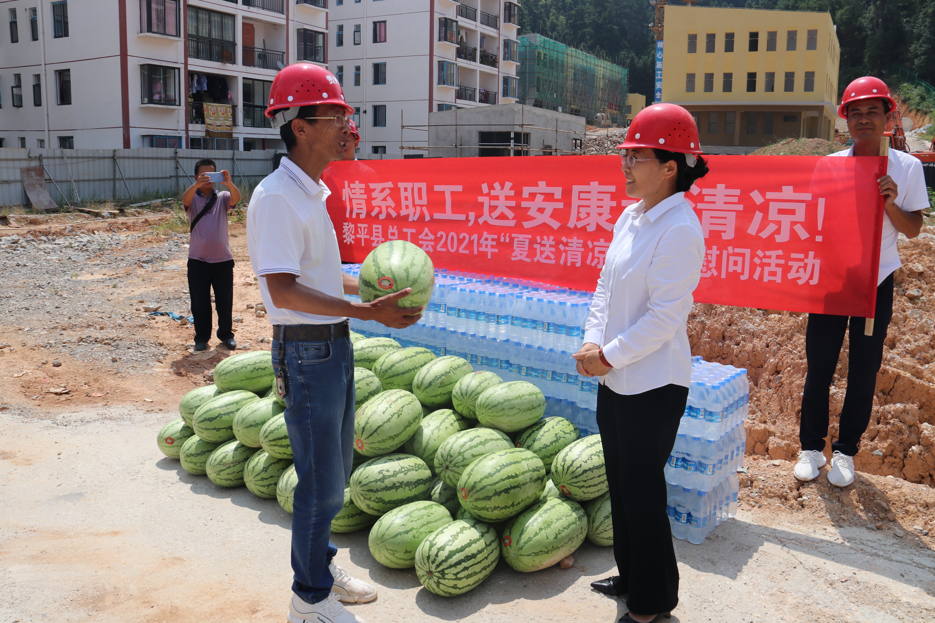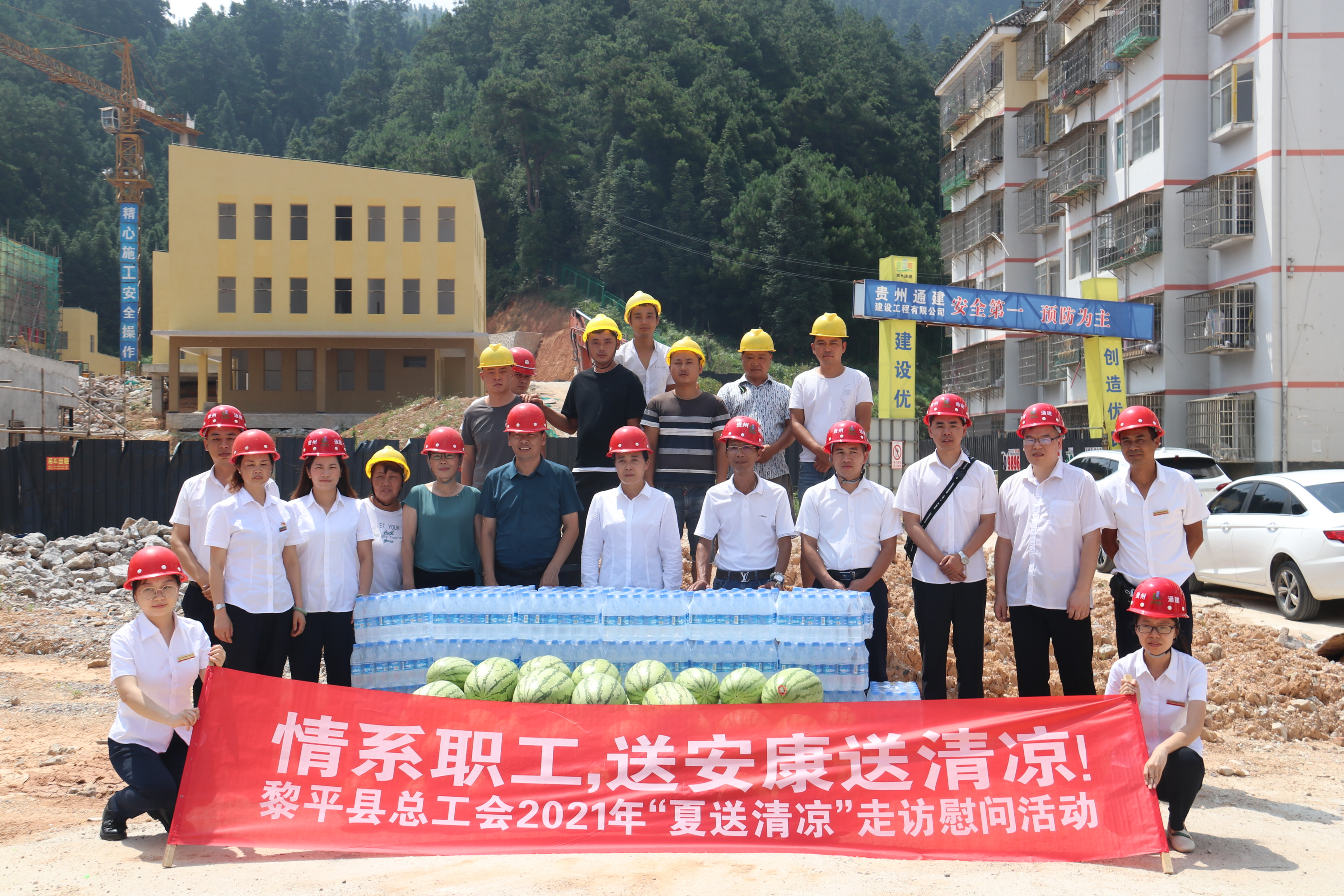 炎炎夏日,酷暑难耐。2021年7月21日上午,黎平县县总工会党组书记常务副主席龙懿、县总工会副主席王平森、县总工会副主席石晓烨等一行6人,深入半岛网页版“黎平县何家庄安置区2号幼儿园建设项目”项目部,亲切慰问冒着酷暑战斗在一线的公司职工、建筑工人,为在高温情况下仍坚持工作的一线工人送去清凉和关怀。本次慰问活动,县总工会共为该项目部工人送去西瓜500公斤、矿泉水50件。