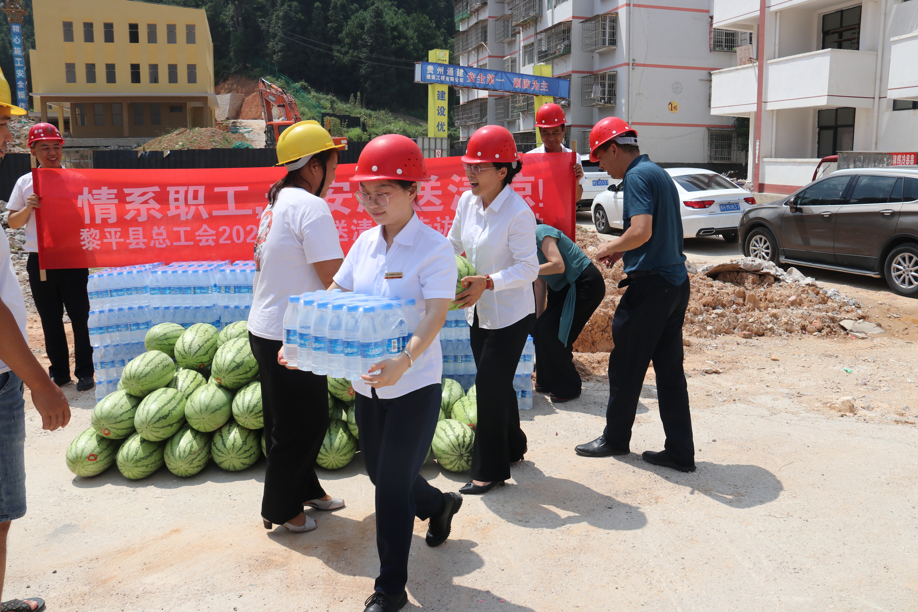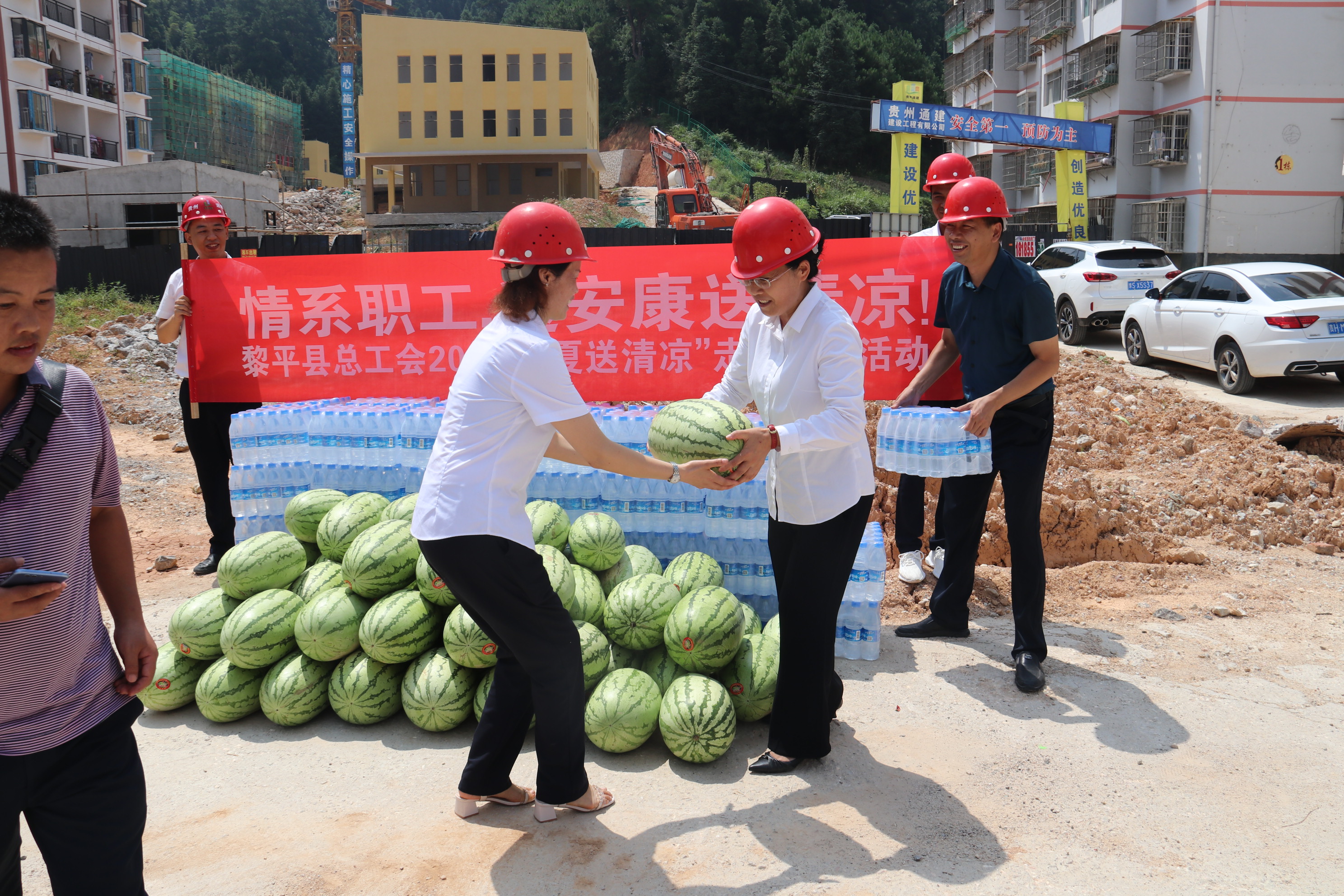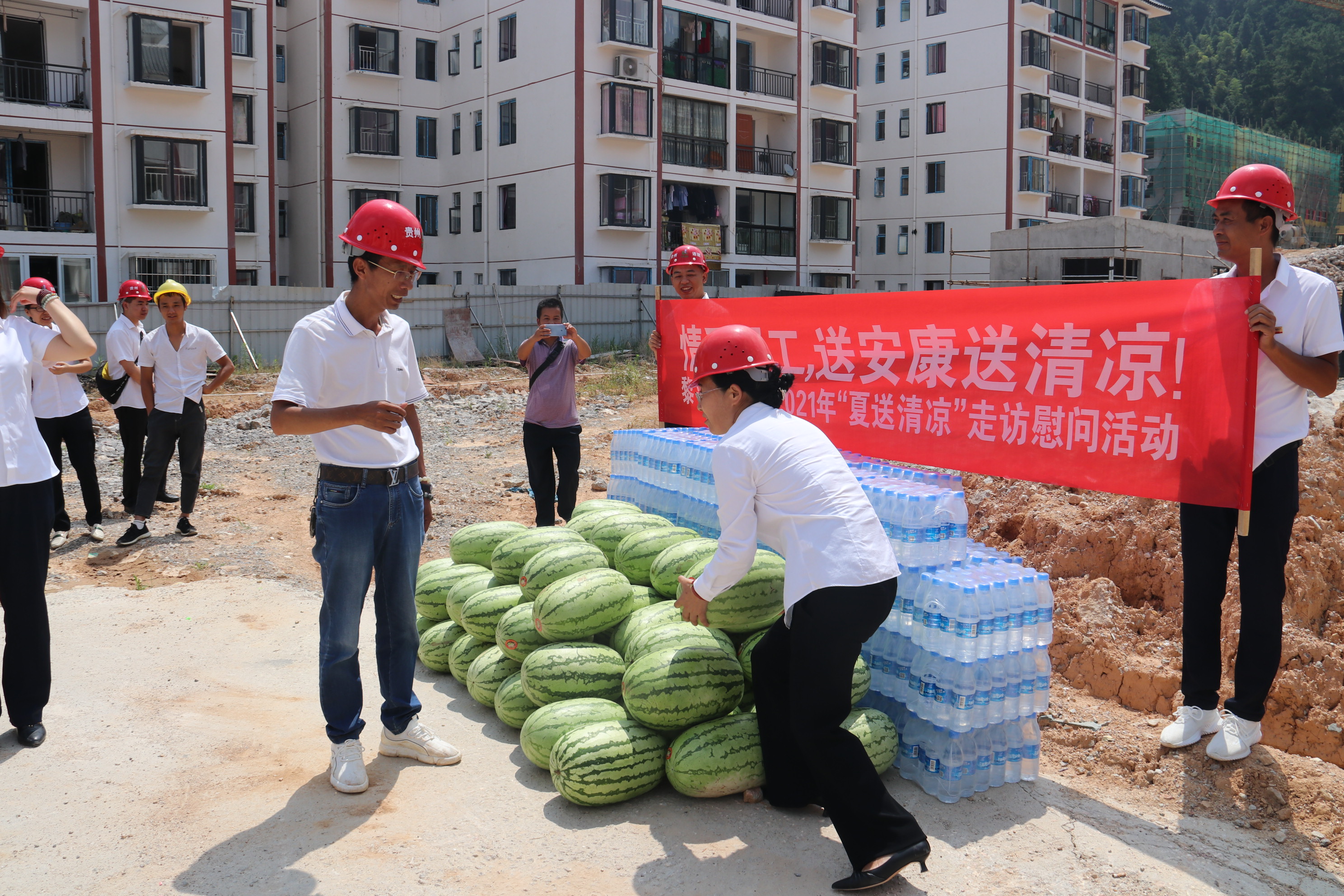 慰问活动中,龙懿常务副主席一行详细了解了工人们的工作、生活情况,对他们冒着酷暑仍坚守岗位,表现出良好的精神风貌表示敬意,随后与贵州通建公司总经理李祖培一道将矿泉水和西瓜分发到工人们的手中。