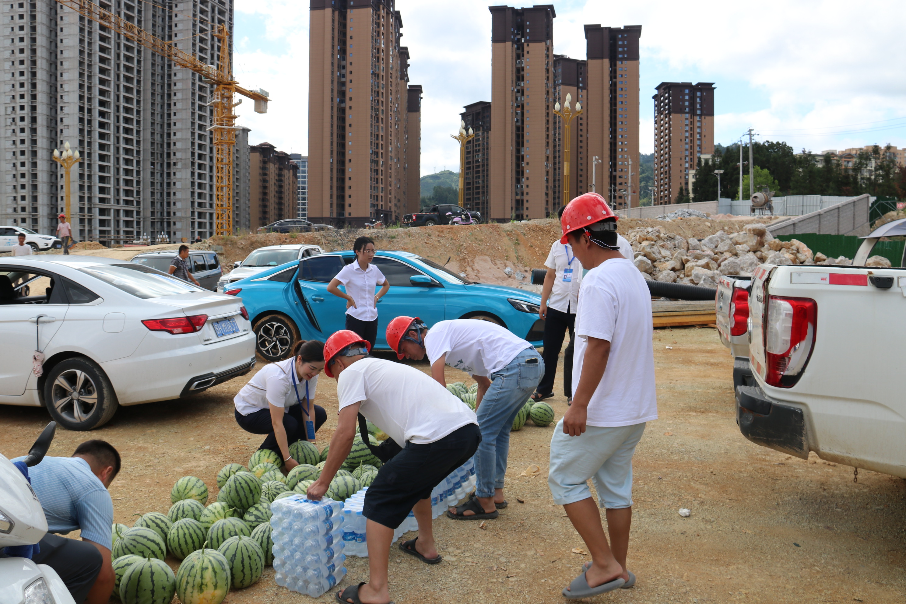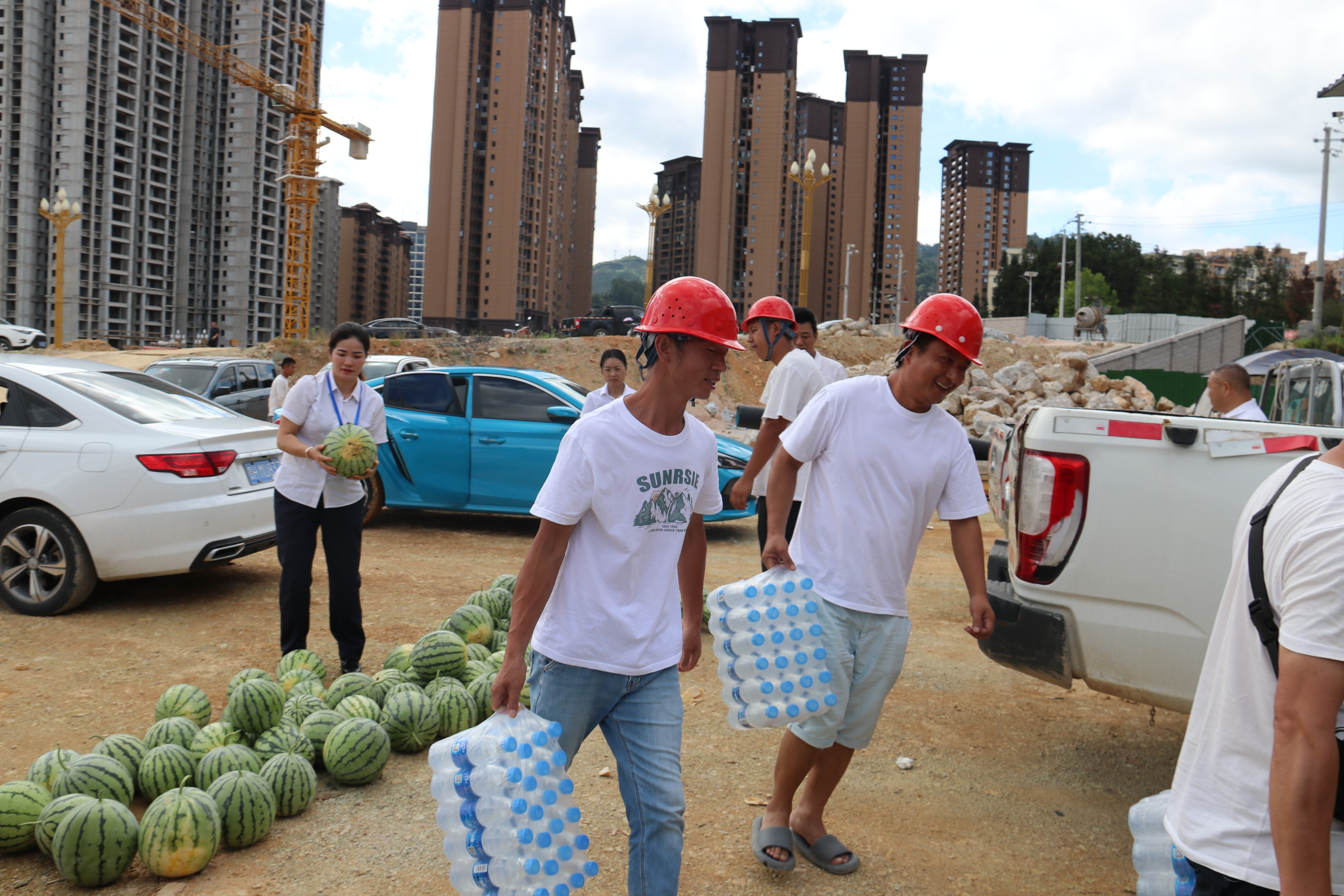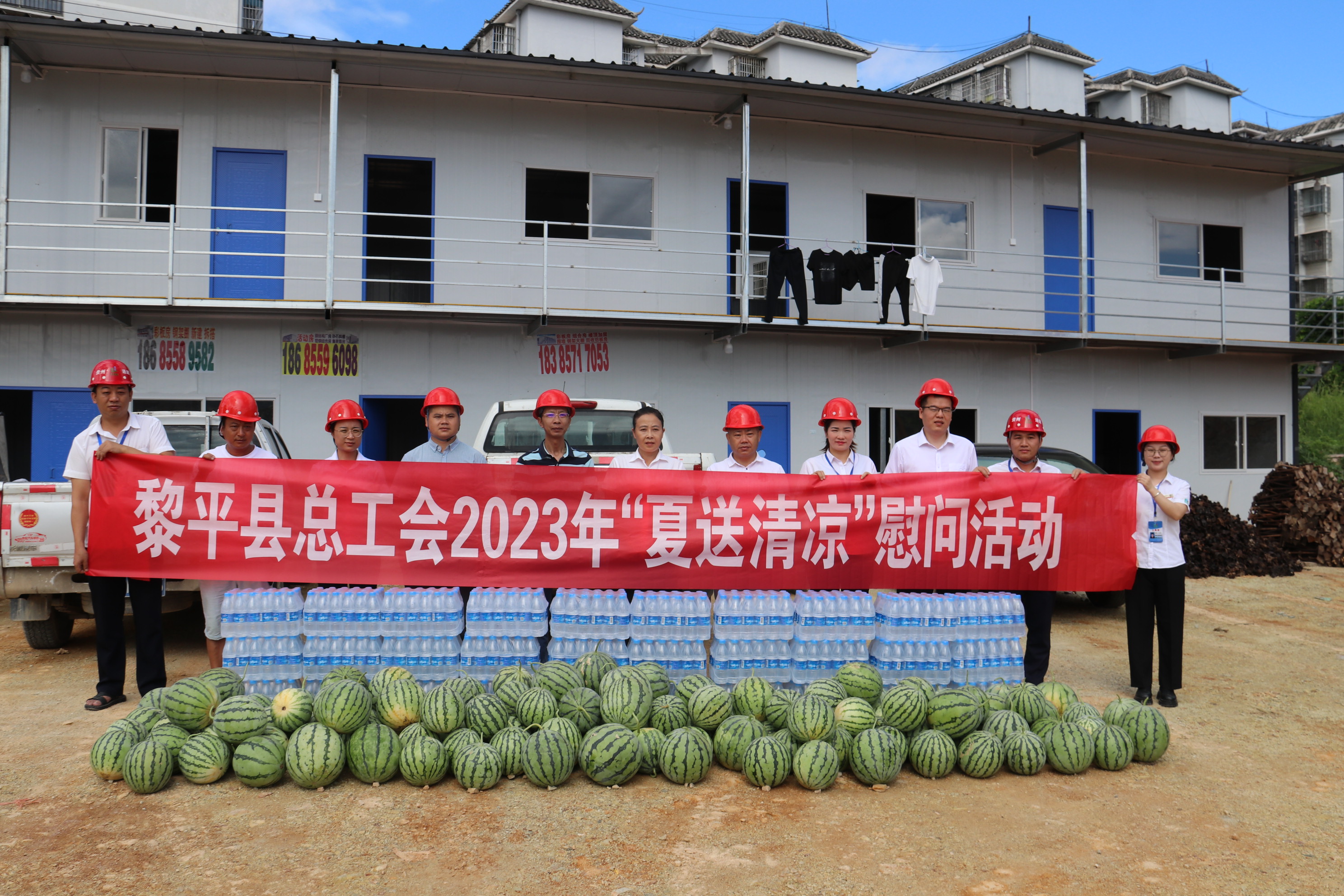 炎炎夏日,酷暑难耐。2023年8月6日上午,黎平县总工会党组书记、常务副主席龙懿带队深入贵州通建建设工程有限公司“黎平县第九小学建设项目”项目部,亲切慰问冒着酷暑战斗在一线的公司职工、建筑工人,为在高温情况下仍坚持工作的一线工人送去清凉和关怀。本次慰问活动,县总工会共为该项目部工人送去西瓜1000余斤、矿泉水30件。